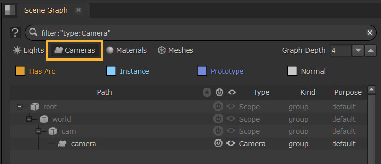 You can also apply filters by typing the syntax in the Scene Graph search bar. For example, for filtering by Type for Cameras, the syntax would be: