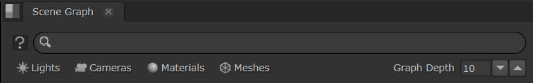 A search bar at the top of the Scene Graph lets you swiftly locate items in the scene, highlighting the search results in bold. Cycle through the results by repeatedly pressing the Enter key, or pressing Shift + Enter to cycle back.