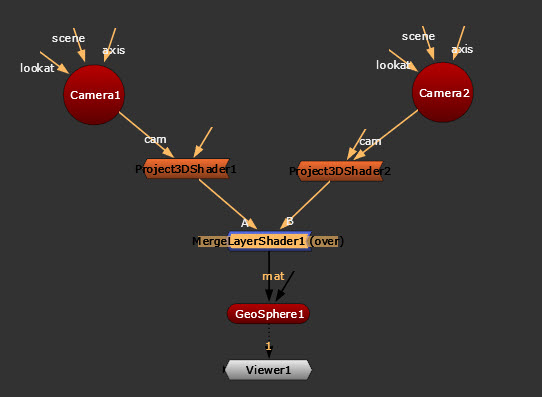 For example, if you wanted to combine two Project3DShader nodes and composite their results onto a GeoSphere, your node tree would look something like the following: