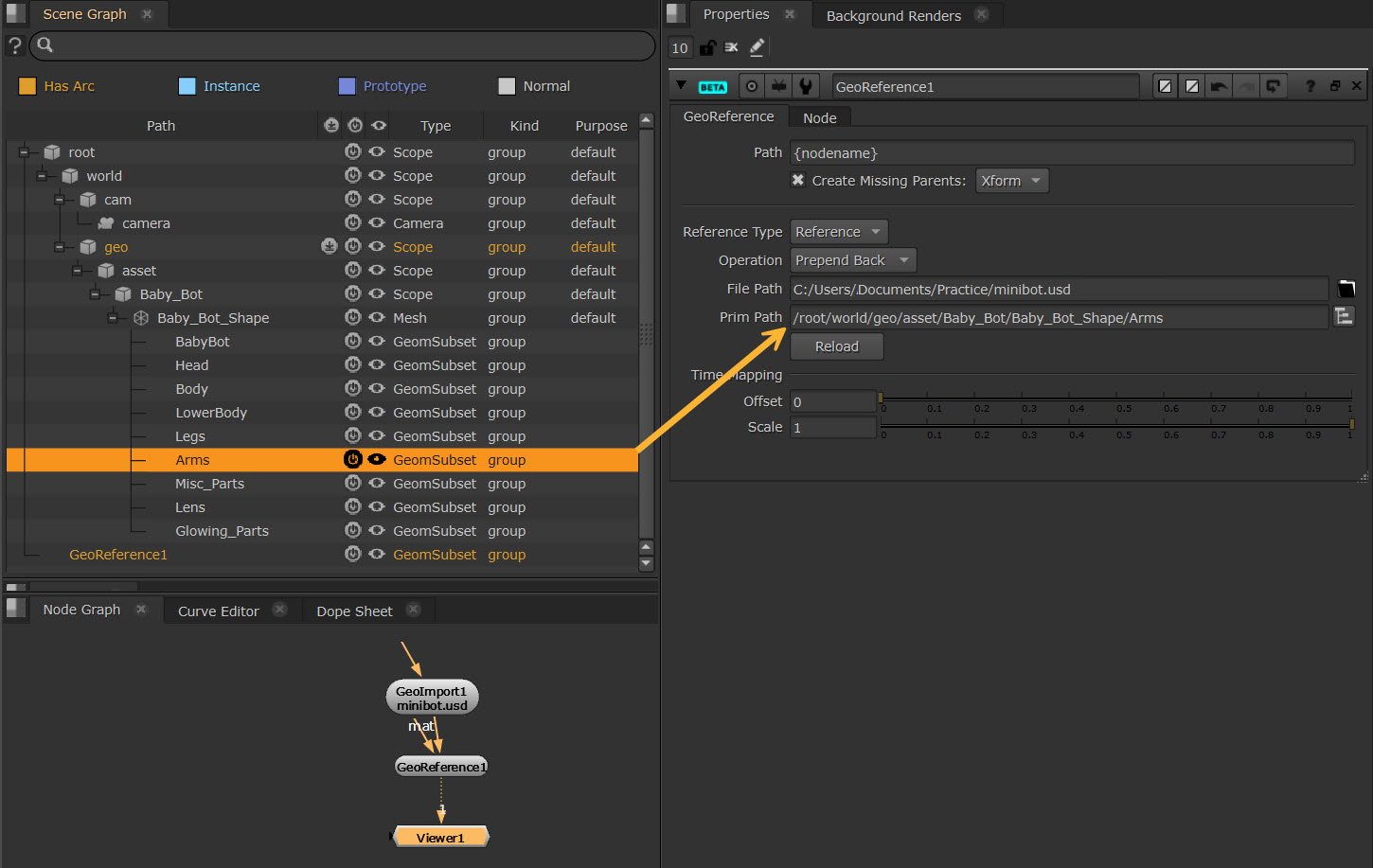 The new reference object is added to the bottom of the scene graph by default using the {nodename} variable in the Path control. In this case, {nodename} is GeoReference1. Create Missing Parents sets the type of prim to create if there are missing ancestors in the path.
