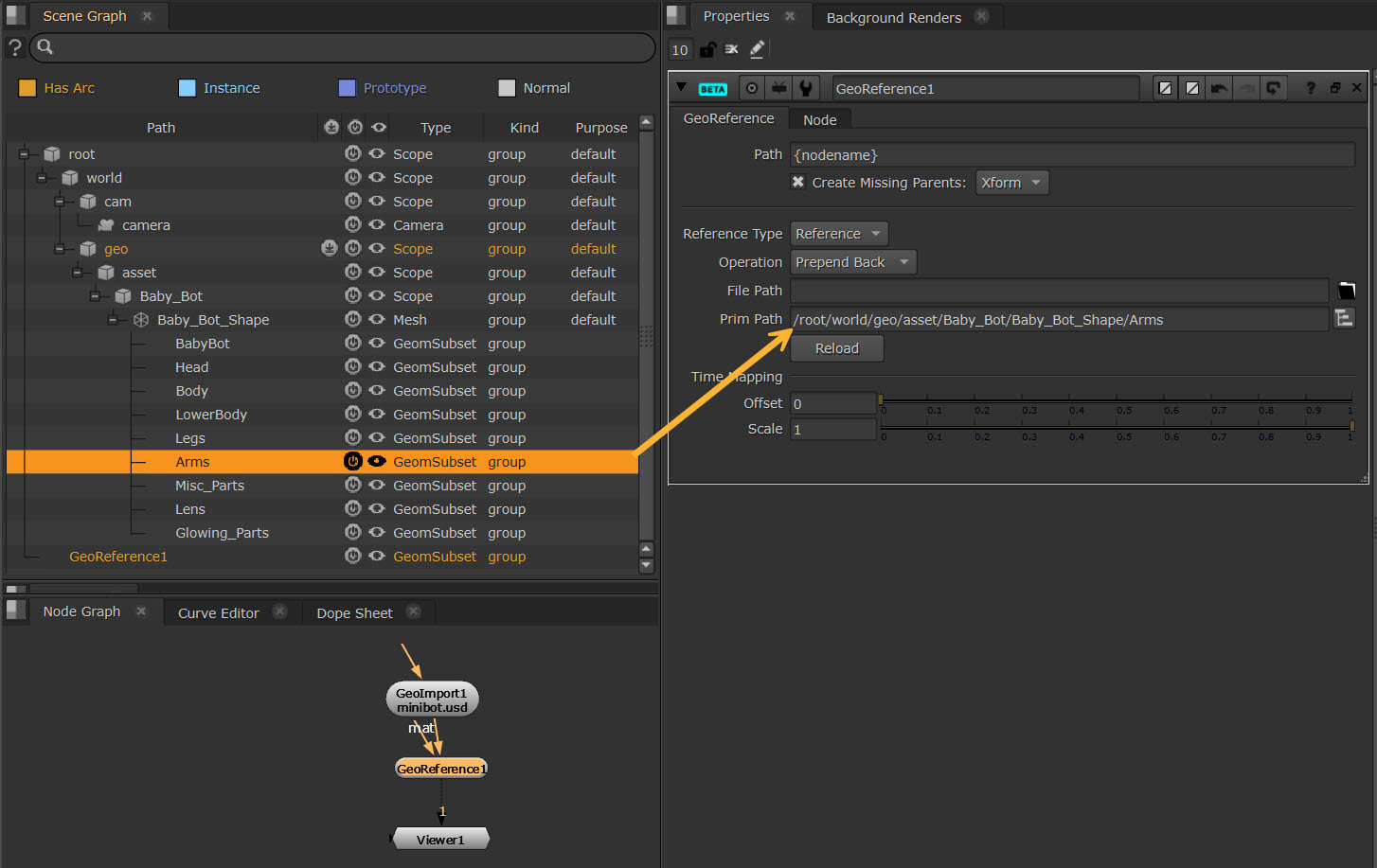 - Enter the Prim Path to the object you want to reference. You can enter the path manually or, if you're not sure what the path is, you can load the file using a GeoImport node and then locate the source object in the Scene Graph tab. Drag the location to the Prim Path control to add it automatically.