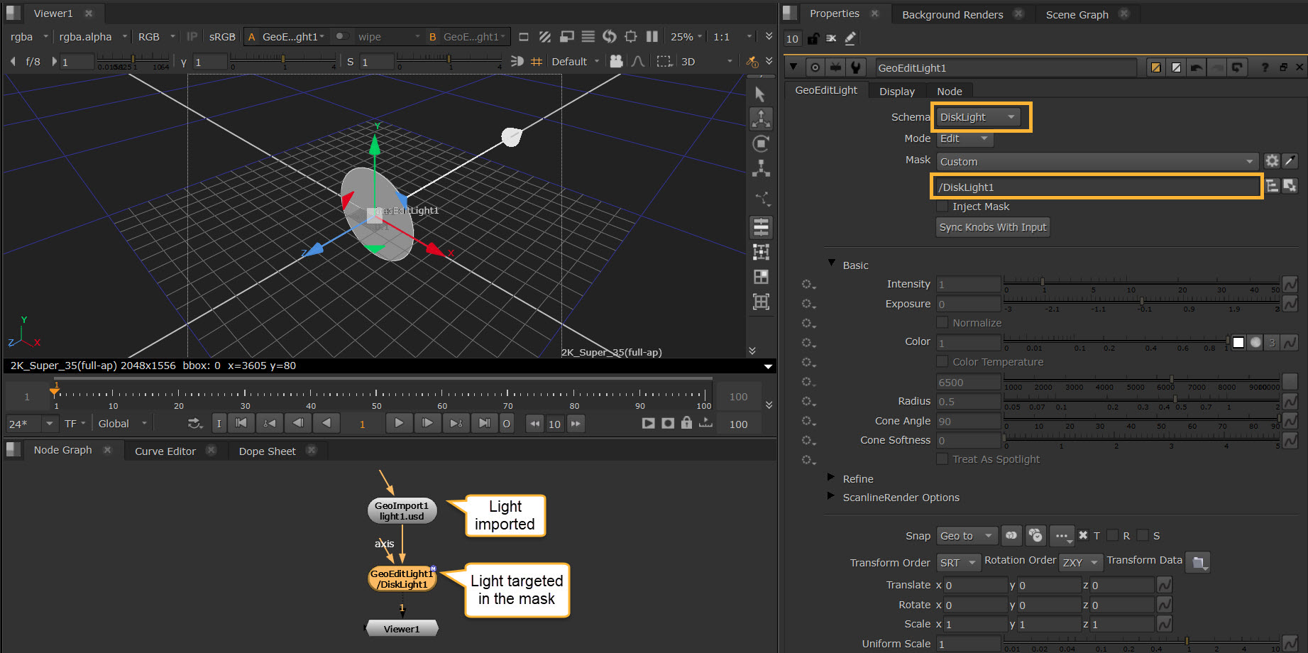 In this example we are using GeoEditLight to target a light from an imported stage by setting the Schema and the Mask.