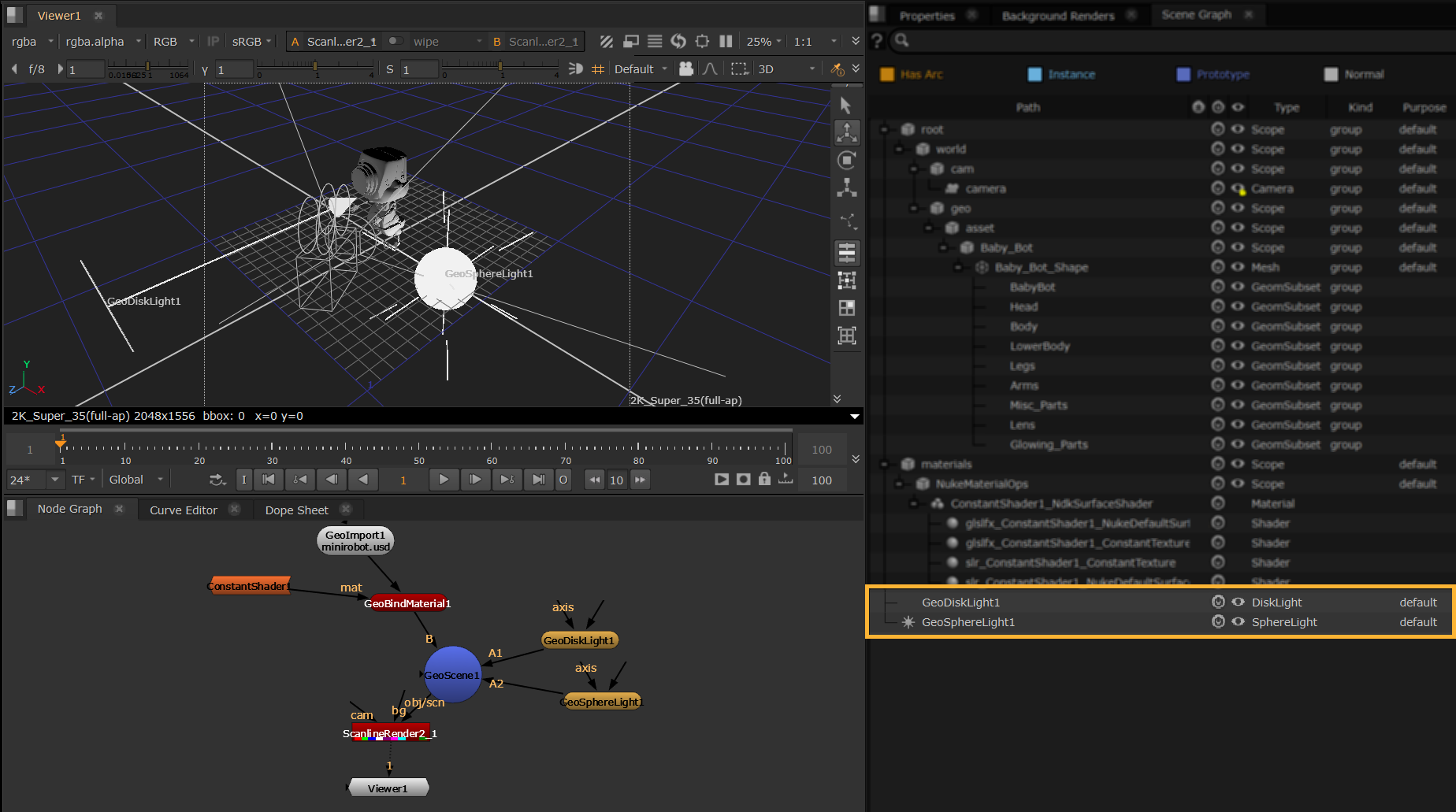 In this example, we are using Create mode, and we have added two of the USD-native light nodes (GeoDiskLight and GeoSphereLight). These appear directly in the Scene Graph as {nodename} - you can change the Path in the light node Properties to adjust this if needed.
