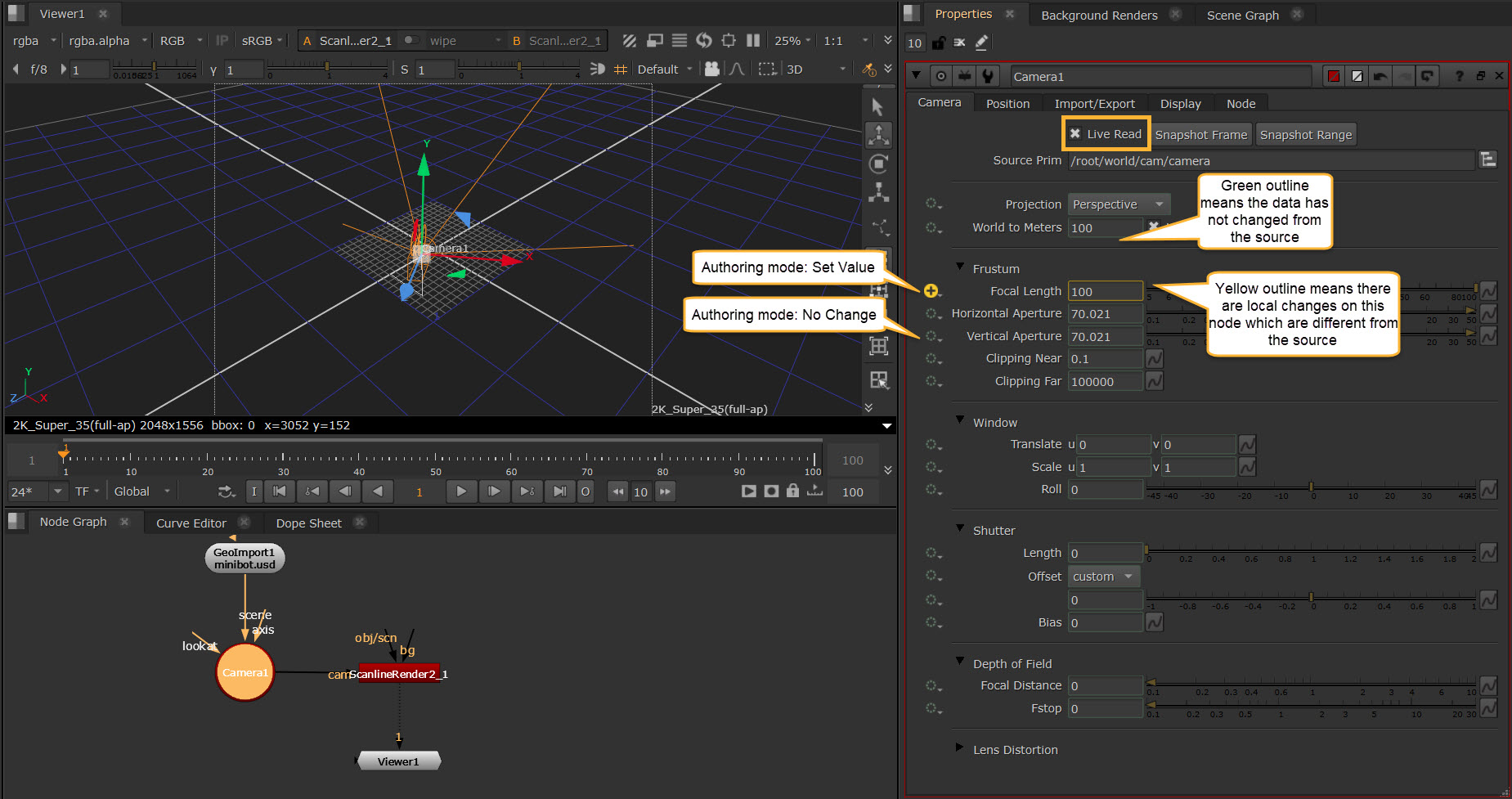 If you are using an imported or referenced camera, and have enabled Live Read, you'll notice that the knobs have a green outline. This helps you to see which data is being read from elsewhere in their script and which data has been changed directly on the node itself.
