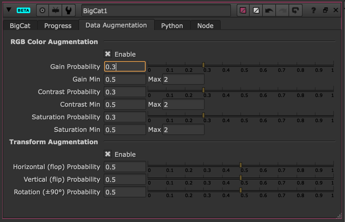 Create extra variation in your dataset from the Data Augmentation tab within the BigCat node. This extra variation supports different lighting conditions and movements within unseen frames and/or shots.