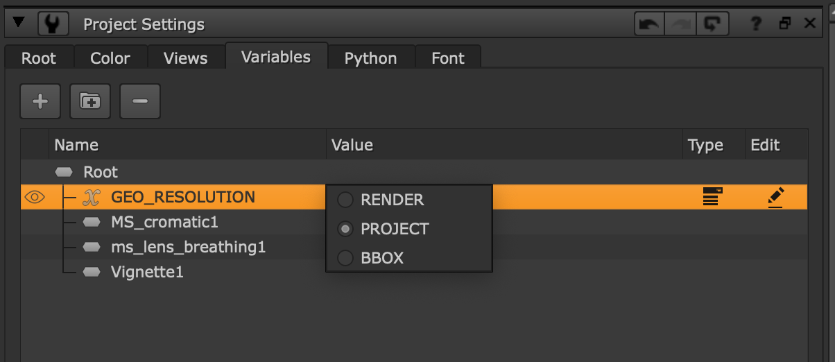 Create GSVs for values that are dynamically updated by setting knob expressions in the Project Settings. GSV expressions are now supported in three specific root knobs: first_frame, last_frame, and fps. This means that even settings like a script's frame range can now be tailored to the artist's current setup.
