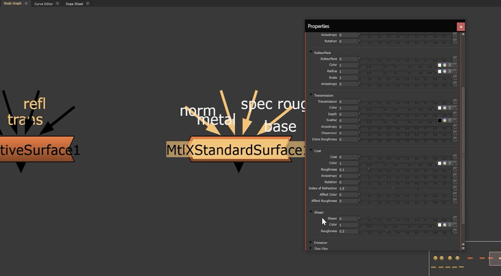 You can adjust controls such as Base, Base Color, Diffuse, Roughness, and Metalness, as well as further options for Specular, Subsurface, Transmission, Coat, Sheen, Emission, Thin Film, and Geometry.