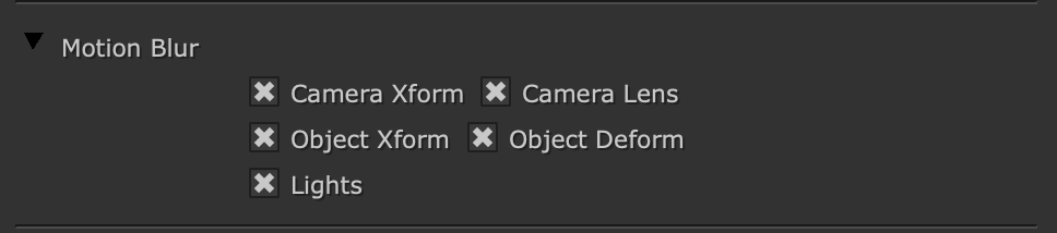 Use Camera Xform to toggle motion blur when the camera is transformed, or Camera Lens when a camera projection control changes. Use Object Xform and Object Deform to toggle motion blur for transforming/deforming objects or Lights for transformed lights.