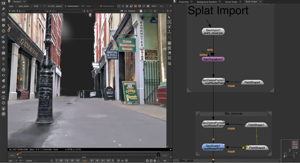Use the new GeoDeletePoints node to non-destructively delete point data, including splats, and color correct splats with the new GeoGrade node.