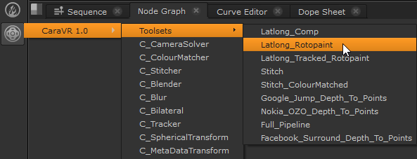 | 1. | Select the point in the node tree you want to apply the paint to, and navigate to CaraVR > ToolSets > Latlong_RotoPaint. |