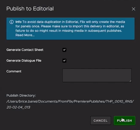 Note: If no new changes have been made to the sequence revision, clicking the Publish to Editorial button opens the directory to which your files have been published. If files are missing from the publish directory, Flix automatically downloads them from the server and stores them in the publish directory.