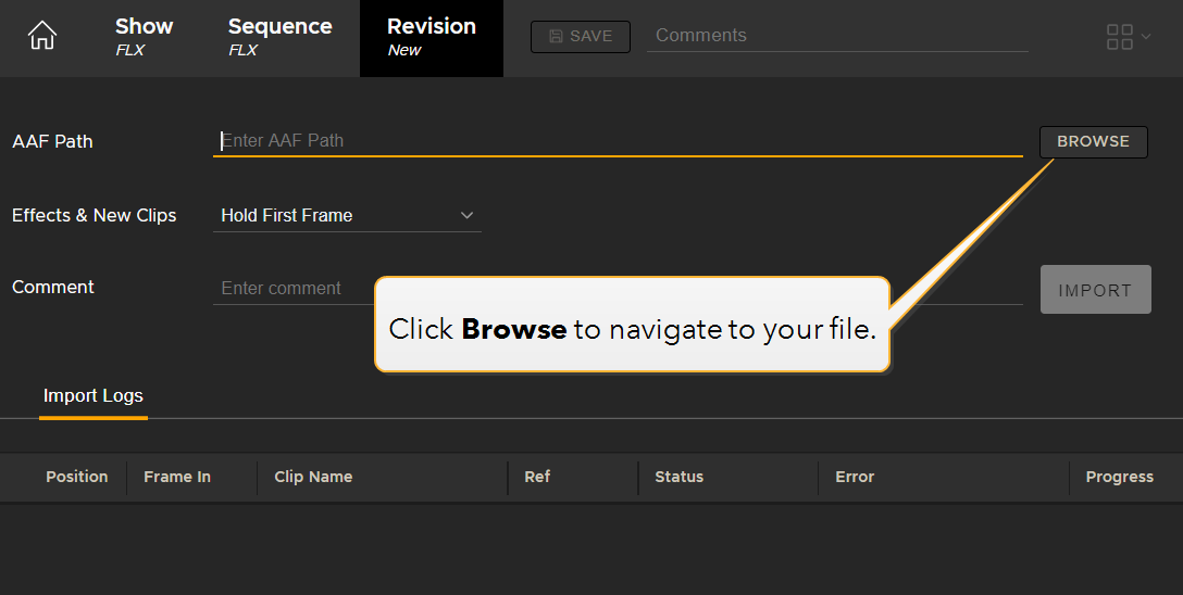 | 5. | Enter a Comment if required and click Import. The comment appears on the sequence revision in the Revisions list. |