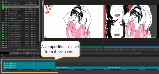 A sequence is automatically created using the imported clips. Any new panels are highlighted in your sequence if you have set the Highlight New Panels preference in Preferences > Third Party Apps > Adobe Premiere.