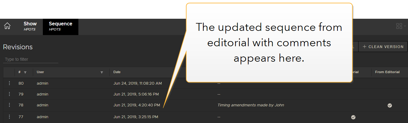 Once you've finished editing a sequence and adding in external media such as Adobe After Effects compositions or a Maya playblast, you can re-import the sequence in Flix and it appears as a new Revision.