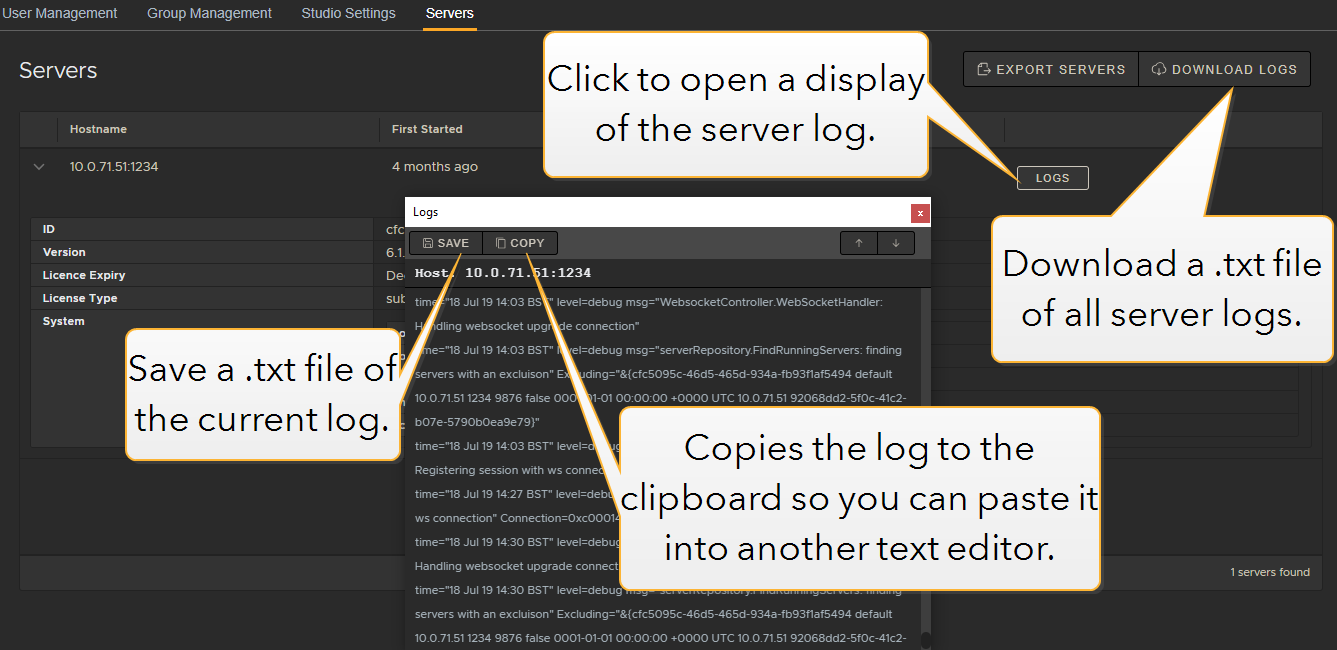 • To access the log file for each server, click the Logs button against each server.