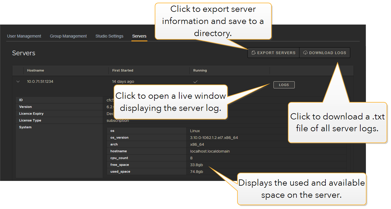 You can check the list of servers running Flix by going to File > Management Console > Servers in your Flix Client. Here you can see the server ID, which version of Flix each server is running and download logs for Foundry support if needed.