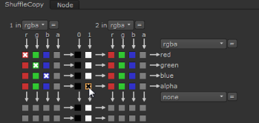 The shuffle nodes also include parameters that let you assign white (1) or black (0) constants to any incoming channel. So, for example, to reset the alpha channel to a full-frame image, you would configure the matrix as follows: