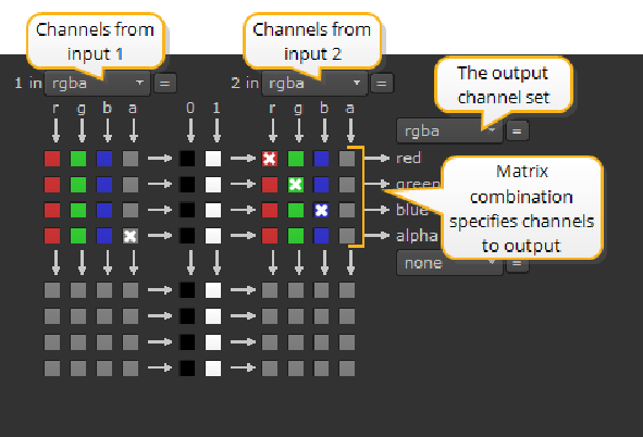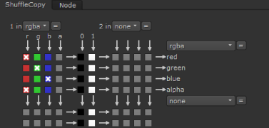 The basic process then for swapping channels is to first select your incoming layers from the 1 in and 2 in (or, in the case of the Shuffle node, the in 1 and in 2) dropdown menus. Then, select your outgoing layers from the dropdown menus on the right. Then make the actual channel swaps by clicking on the resulting matrix.