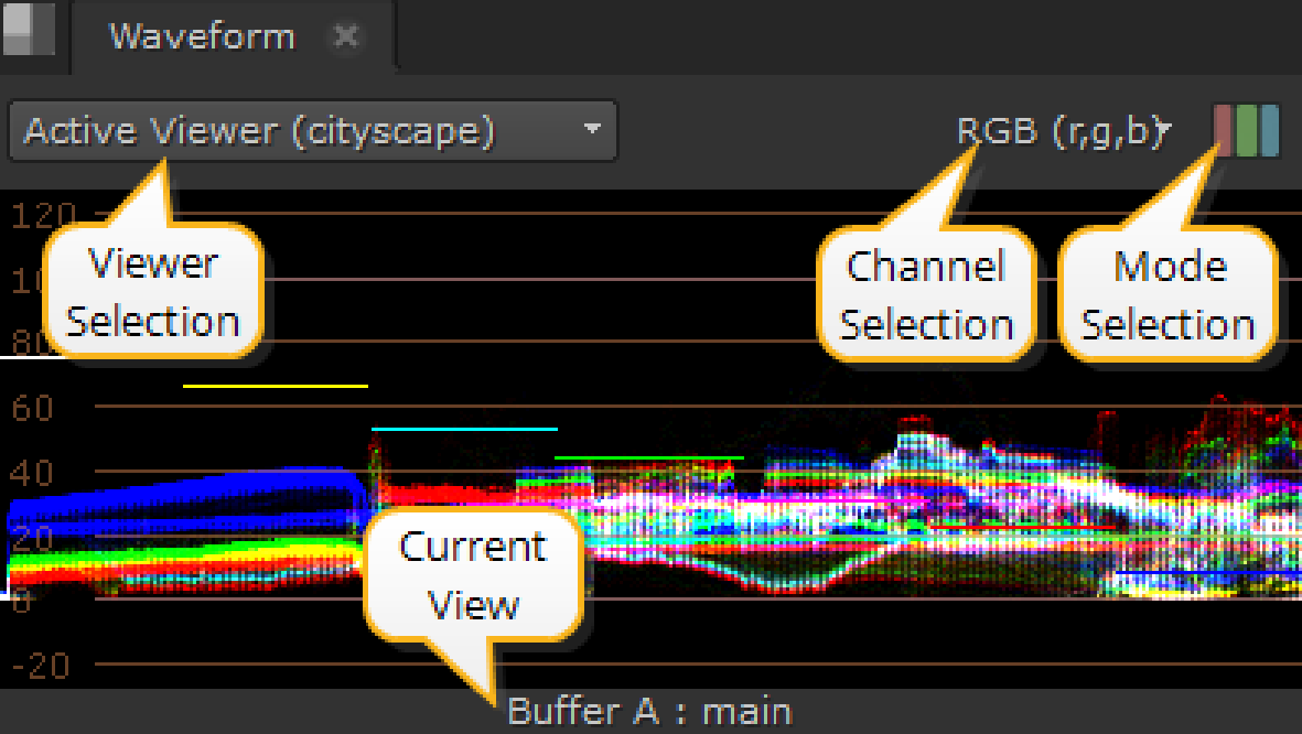 The content menu Windows > New Scope > Waveform scope provides information on luminance, or brightness, which you can use to decide whether the footage is over or under exposed. The information represents luminance values from 0 - 100% (black through the spectrum to white). The higher the waveform, the brighter the image in the Viewer.