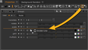 You can add dividing lines between controls to delineate between groups of knobs, such as transform and color knobs. To add a divider, drag-and-drop a Divider Line knob between the controls you want to separate.