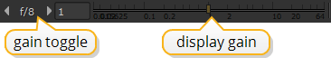 The gain and gamma sliders let you adjust the displayed image, without affecting your final output. These controls are useful for tasks like spotting holes in mattes. You can boost or reduce gain by entering a multiplier (exposure value), dragging on the slider, or using the F-Stop arrows. Boost or reduce gamma by entering a gamma level or dragging the gamma slider.