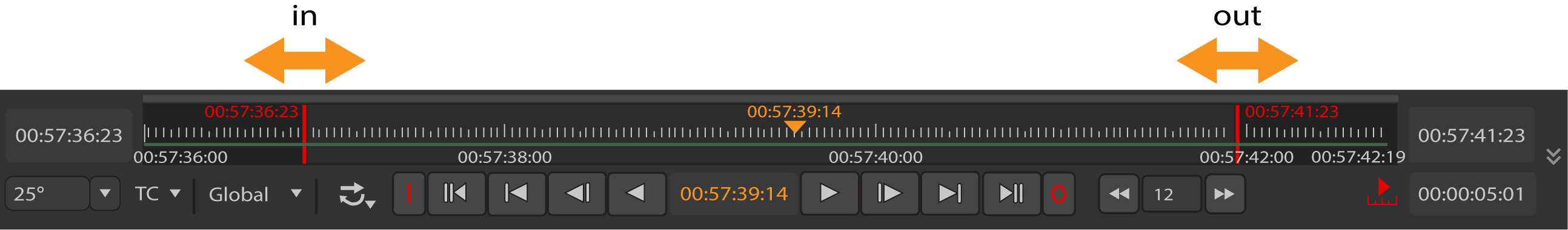 Tip: The current frame and in an out point fields accept simple mathematical functions, such as +/-20 to jump forward or backward 20 frames or +/-00002000 to jump forward or backward 20 seconds.