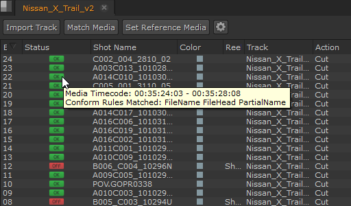 Conforming describes the process of matching up the footage from a shoot with the required edit decisions to create a meaningful timeline. Nuke Studio accepts sequences either from EDLs (edit decision lists), AAFs (advanced authoring format), or Final Cut Pro XML files from a specified directory structure containing the source media files. Nuke Studio attempts to conform the media, warning you if there are missing media.