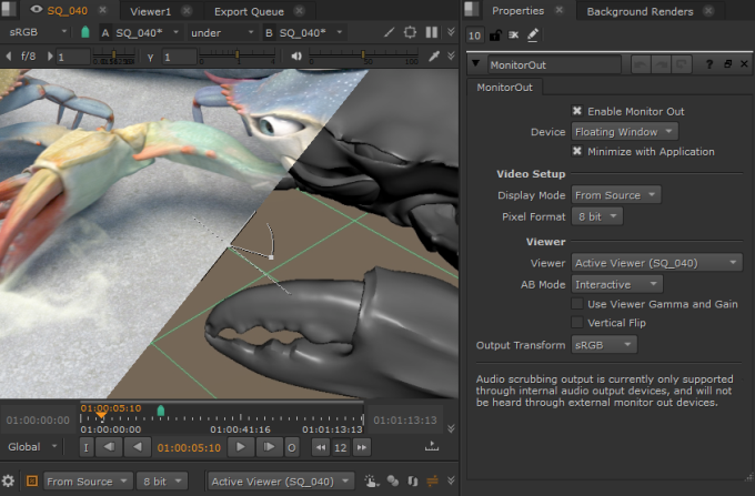 The Monitor Out feature allows you to preview Viewer images in a floating window or on an external projector/video monitor to check the final result, including the correct output transform and aspect ratio.