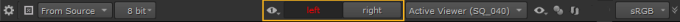 If you're working with multi-view footage in Interactive buffer mode, the monitor shows the output from the selected Viewer including the A/B player mode currently in use, such as wipe or difference. In Active, Buffer A, or Buffer B mode, additional controls display to determine the stereo mode and view to output.