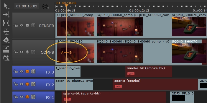 The Viewer A/B tools allow you to quickly compare media using the two Viewer input buffers. Select a clip, sequence, shot or track and press 1 or 2 to place your selection in the Viewer input buffers. You can also drag-and-drop items into the input buffers using the Viewer hotspots.