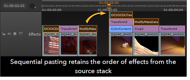 Unlike standard paste, sequential paste only pastes each effect once, in the order that they appear on the source shots.