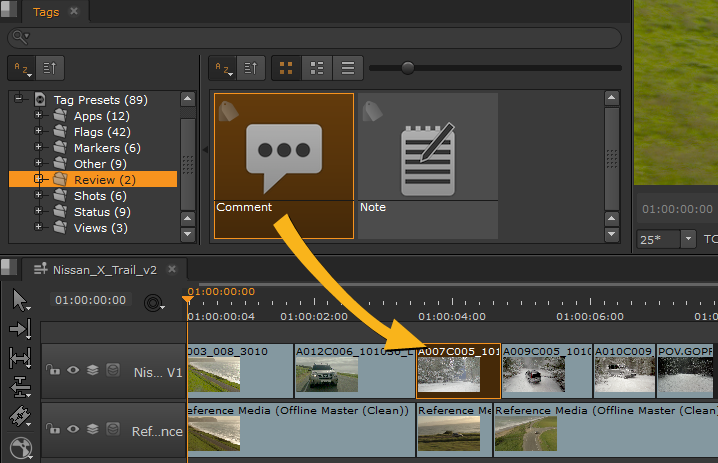 Depending on where the tag is dropped, you’ll mark a shot (or items if you make multiple selections) or a track.