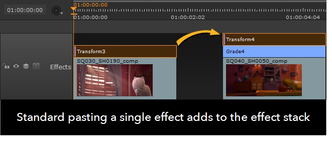 Standard copy and paste adds the copied effect(s) to the stack on the target shot(s). Effects are read from the top down, so pay attention to the order of the stack.