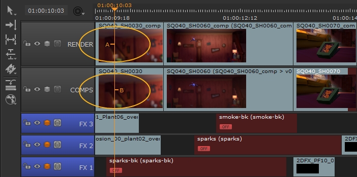 The timeline playhead indicates what is currently displayed in the Viewer using a number of different display markers. Swapping tracks between buffers automatically updates the playhead so that you always know which tracks you are looking at in the Viewer.