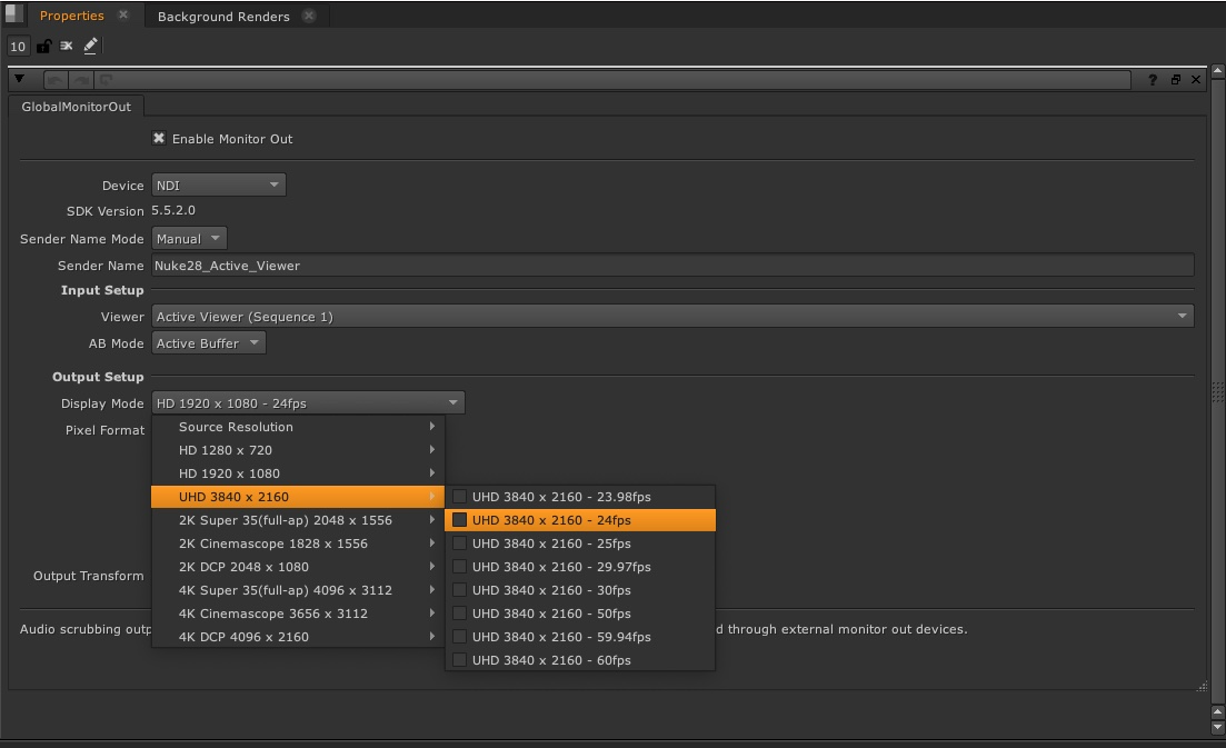 5. Set the Display Mode for the receiver device of the NDI stream. If you don't change this, Nuke broadcasts the source resolution of the project over NDI. However, this format may not be supported on the receiving device, so you can set the NDI stream to scale to a specific resolution and frame rate here.