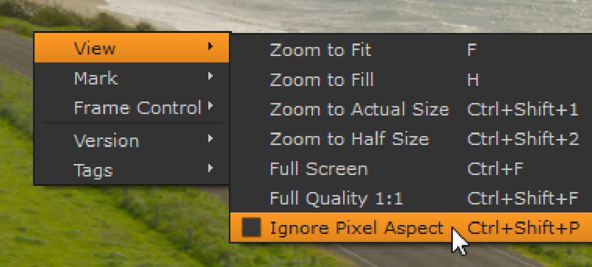 If for any reason you want to display an anamorphic clip with a 1:1 aspect ratio, right-click in the Viewer displaying the clip and enable the Ignore Pixel Aspect checkbox, or use the Ctrl/Cmd+Shift+P keyboard shortcut.