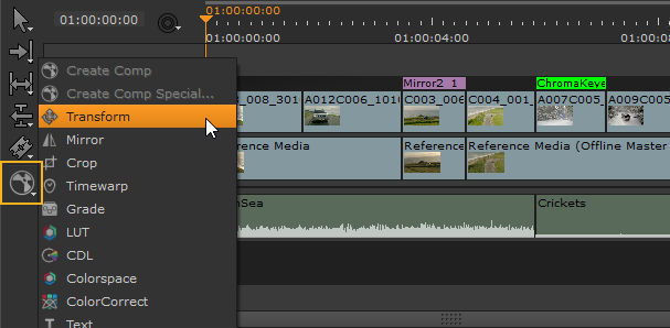 Translate, rotate, scale, and skew shots from a single control panel. Alt+T inserts a Transform soft effect on any shot selections or at the playhead |