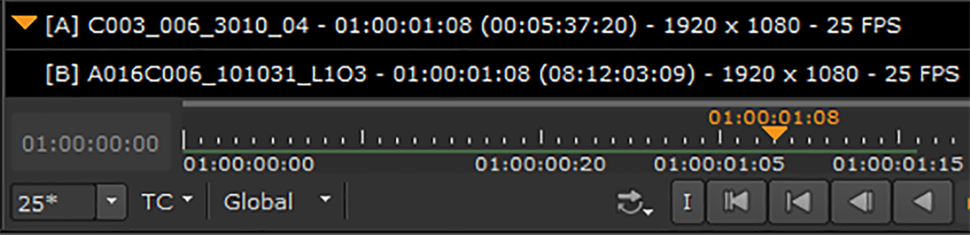 When both Viewer inputs contain clips, the audio output is set by the orange marker in the color picker information bar, displayed by clicking . In the following example, input A is providing the audio output: