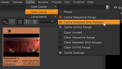 • Select the required clip range in the Sequence tab and then select Cache > Disk Cache > Cache Selected Shot Ranges from the menu bar.
