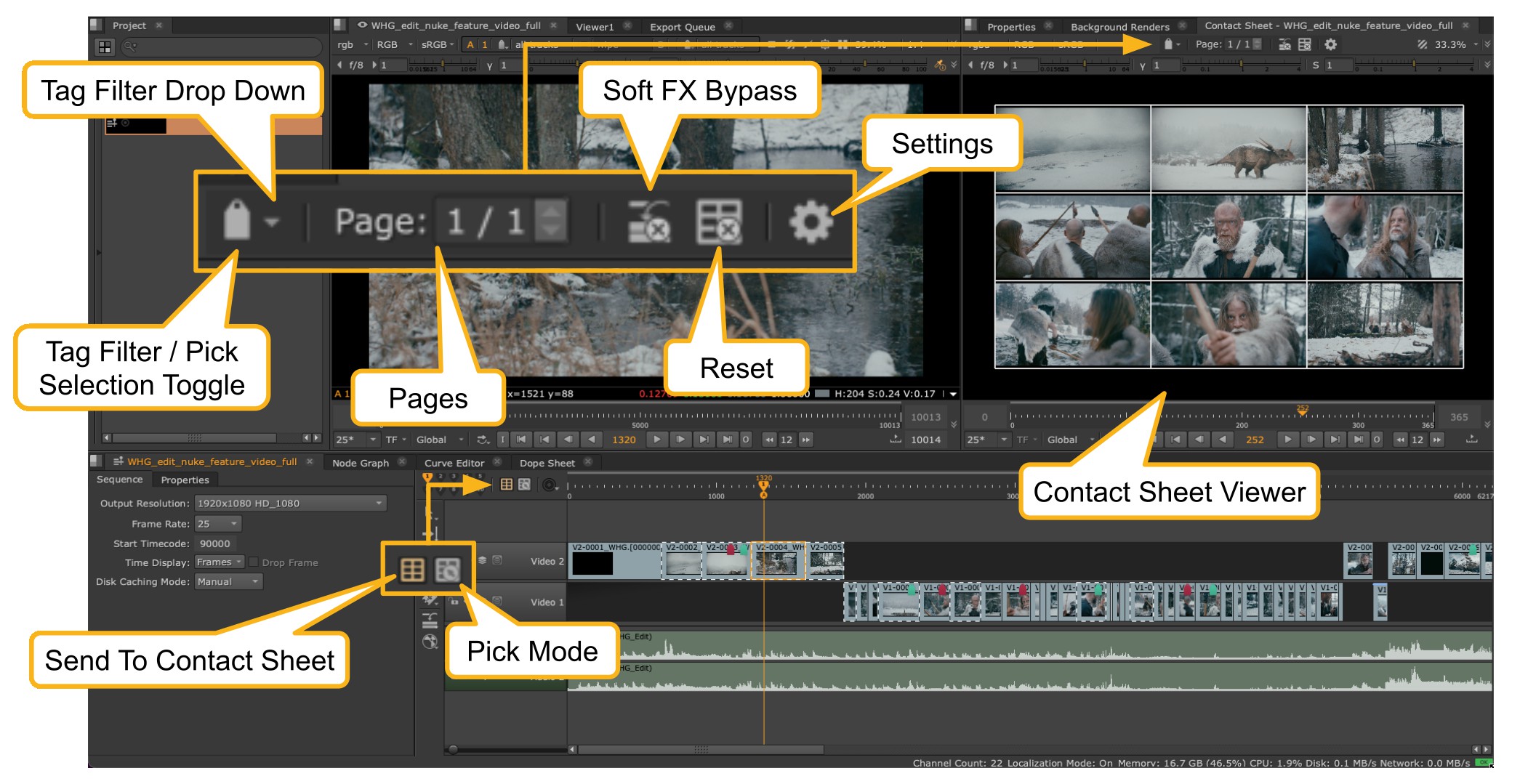 Contact Sheet is compatible with existing timeline Soft Effects, although multiple stacked Soft Effects and BlinkScript effects may impact responsiveness.