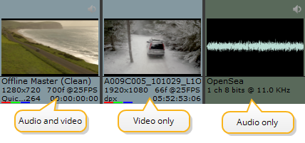 The interface sorts your clips into three broad categories: Audio and Video, Audio Only, and Video Only. Clips are displayed differently depending on their content, location, and in the case of the Viewer, the current mode.