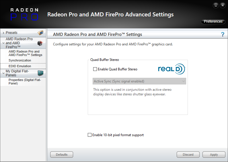 2.   Navigate to the AMD Pro Settings and check Enable Quad Buffer Stereo.