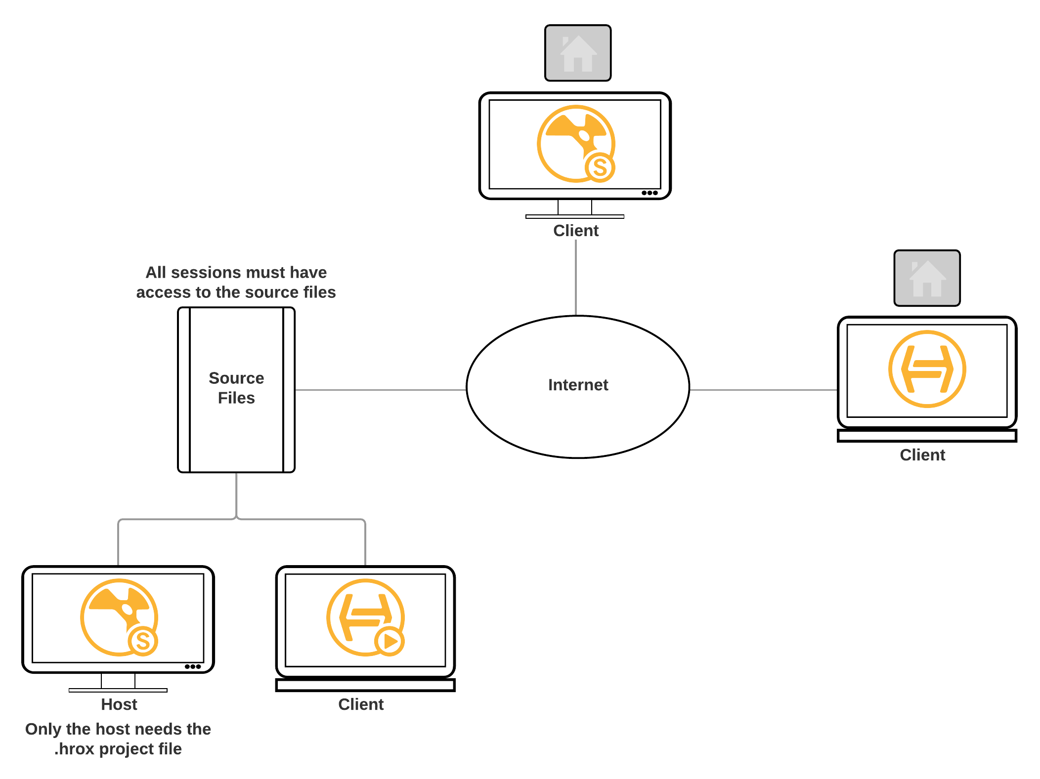 Sync Review works by connecting clients to the host using the host's IP address or hostname and an open port number. The project .hrox file only needs to exist on the host machine, but the source clips referenced by the shots on the timeline must be available for all participants either locally or from a central server.