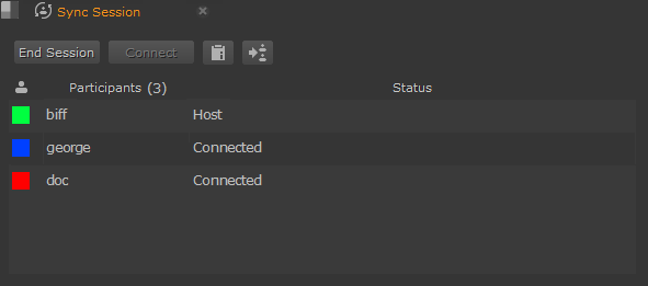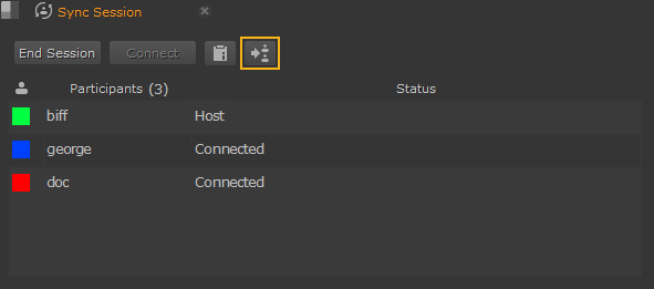 If participant sessions are out of sync, you can push actions to other participants manually. Click the update button in the Sync Session panel or use the Ctrl/Cmd+P keyboard shortcut to force an update across all participant sessions.