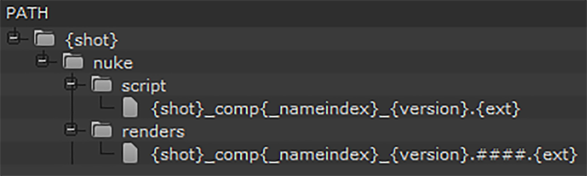 • {shot}_comp{_nameindex}_{version}.####.{ext} appends padding and the specified file extension. For example, Shot01_comp_v03.0001.dpx
