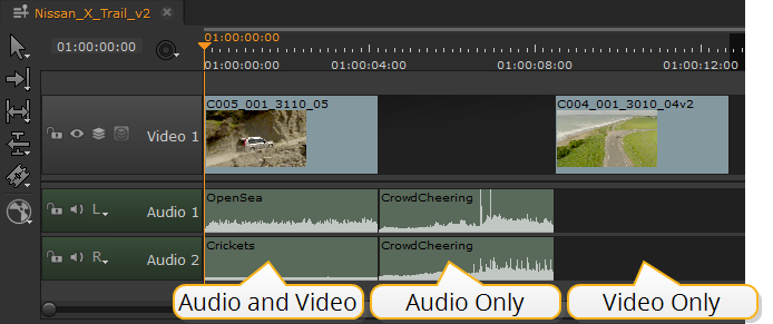The interface sorts your clips into three broad categories: Audio and Video, Audio Only, and Video Only. Clips are displayed differently depending on their content, location, and in the case of the Viewer, the current mode.