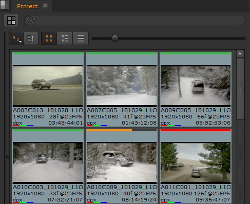 As clips are localized, an amber progress bar displays in the thumbnail. Fully cached clips are marked with a green bar at the top of the thumbnail and out-of-date clips are marked in red.