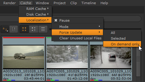 on - checks for updates to source clips for all localization policies, and localizes those files set to On or From auto-localize path automatically. On demand source clips must always be localized manually.