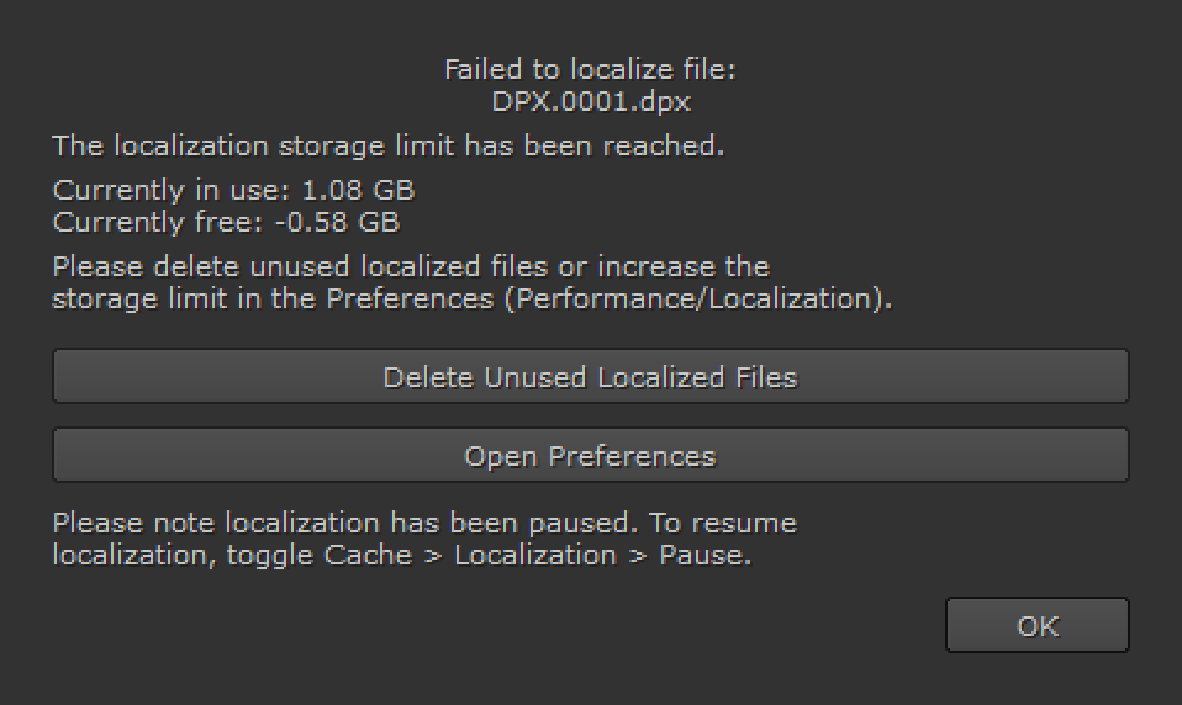 Localizing a large amount of files can fill up the localization cache quite quickly if you leave the limit to (GB) preference at the default 10 GB. When the cache runs out of space, a Failed to Localize File dialog displays and localization pauses.