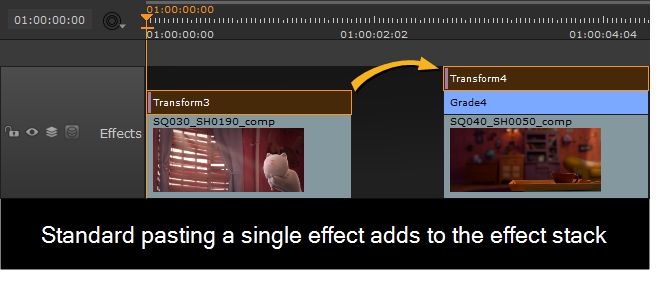 Standard copy and paste adds the copied effect(s) to the stack on the target shot(s). Effects are read from the top down, so pay attention to the order of the stack.